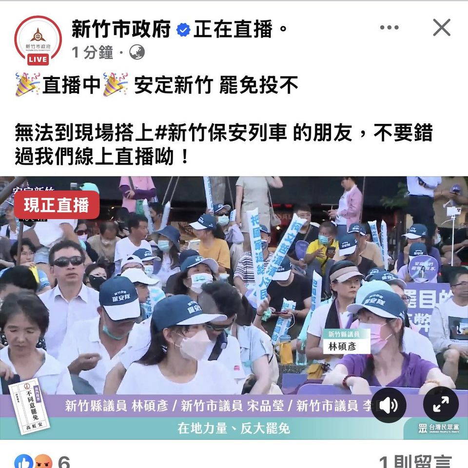 ▲新竹市府在官方臉書直播民眾黨反罷活動,事後澄清為廠商誤植。(圖/翻攝新竹市議員曾資程臉書)
