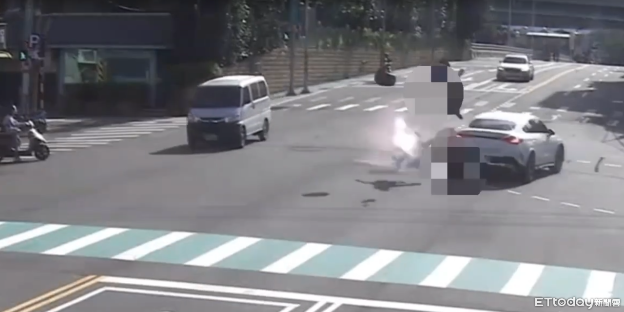 畫面中可以看見,重機騎士正從南興橋騎下,準備左轉通過路口時,對向直行的賓士見狀煞車不及,當場將人車撞噴,騎士更在空中轉了兩圈後慘摔在地,恐怖瞬間相當驚悚。