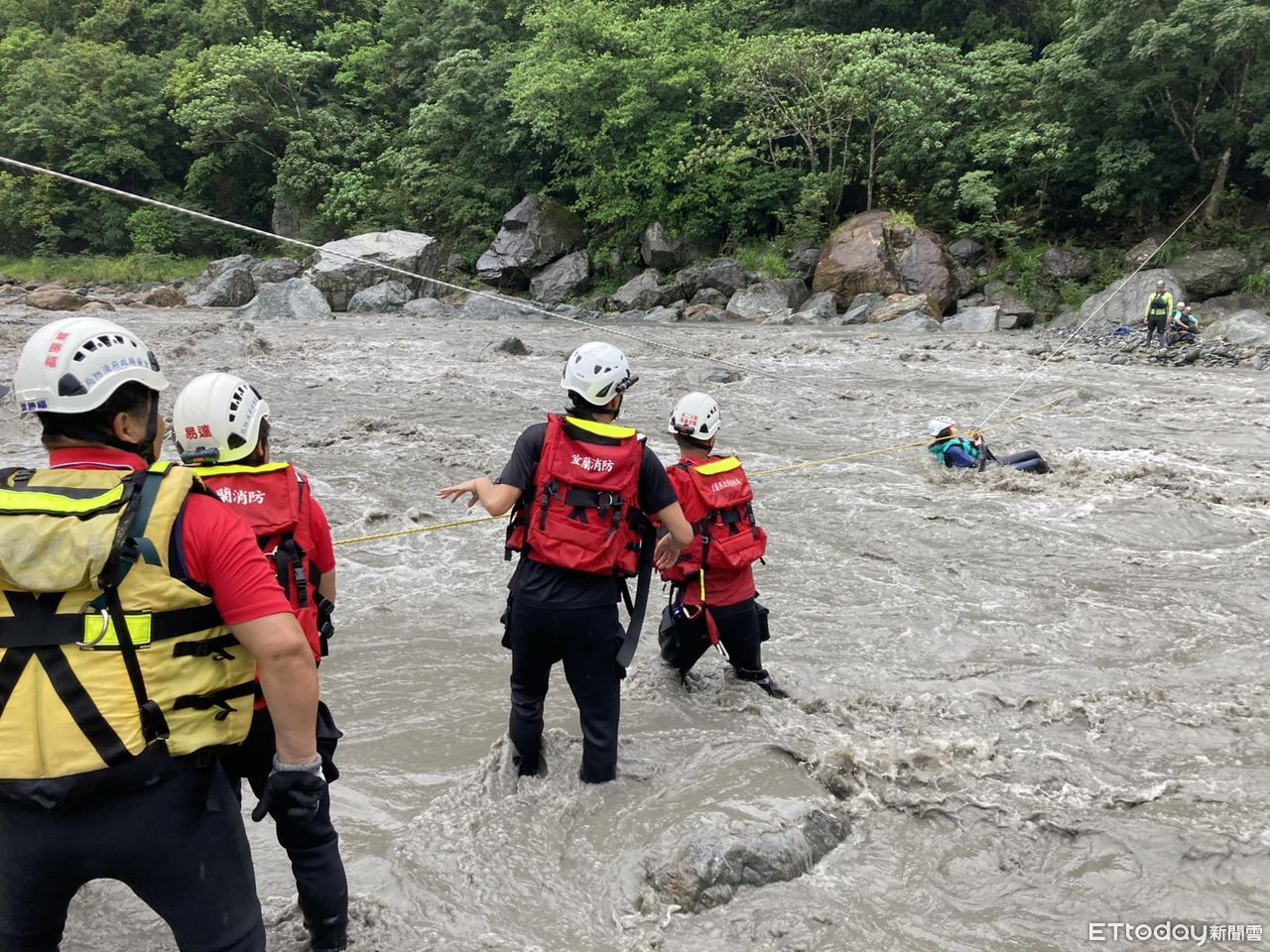 ▲救援人員在兩岸架設橫渡繩索,驚險將5名受困者護送過河。(圖/記者游芳男翻攝,下同)
