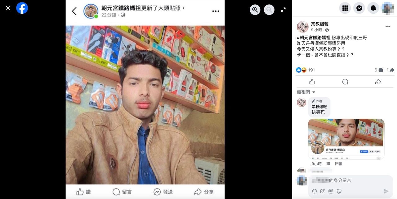 ▲印度小哥照片一度變成朝元宮鐵路媽祖粉專大頭照。(圖/翻攝臉書,下同)