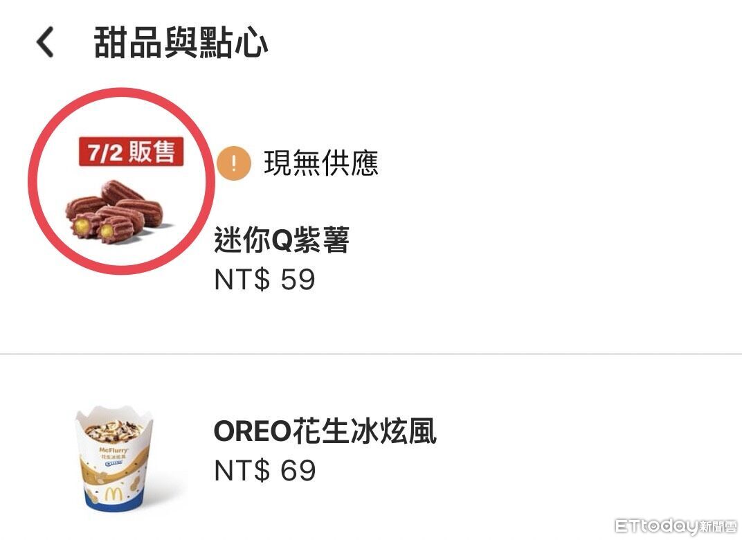 《ETtoday新聞雲》記者今日點進麥當勞APP「手機點餐」發現「新品搶先看」隱藏版功能,可以看到甜品與點心中悄悄出現「迷你Q紫薯」新品,而漢堡與沙拉則出現「雙層麥香魚」選項,雖皆顯示暫無供應,卻搶先曝光販售日期,預計將在7月2日起正式開賣,包括售價也同步公開。