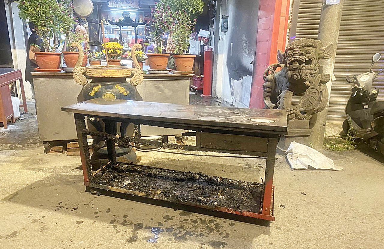 ▲桃園市張姓男子去年11月間酒後短短1小時內,以打火機在桃園區玉山街等4處土地公廟縱火,圖為香案前被焚燒證據。(資料照/桃園警方提供)