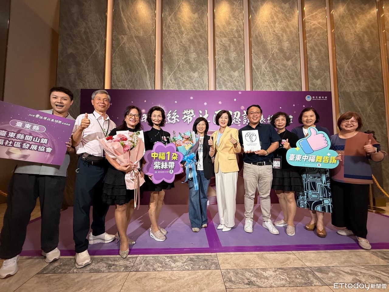為提升社會大眾對家庭暴力防治與性別平等議題的重視,衛生福利部持續推動「紫絲帶社區初級預防認證制度」,鼓勵地方與基層社區共創無暴力生活環境。21日於台北格萊天漾大飯店舉行的「紫絲帶社區認證表揚典禮」中,全國共40個社區發展協會獲頒認證獎座,其中,台東縣關山鎮中福社區發展協會成功獲得「1朵紫絲帶」殊榮,成為台東縣首度取得此認證的防暴社區,展現地方深耕宣導與防治工作的成果。