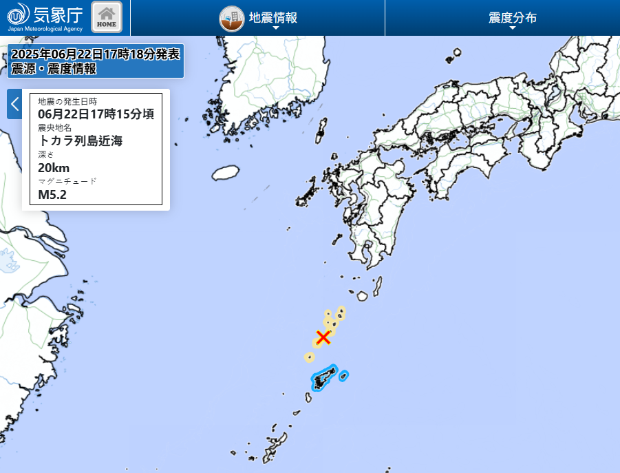 根據氣象廳觀測,日本鹿兒島縣外海22日下午再度發生地震,多個地區感受到強烈搖晃。此次震央位於吐噶喇群島外海(北緯29.4度、東經129.3度),震源深度約20公里,地震規模初估為5.2。鹿兒島縣十島村觀測到最大震度4。