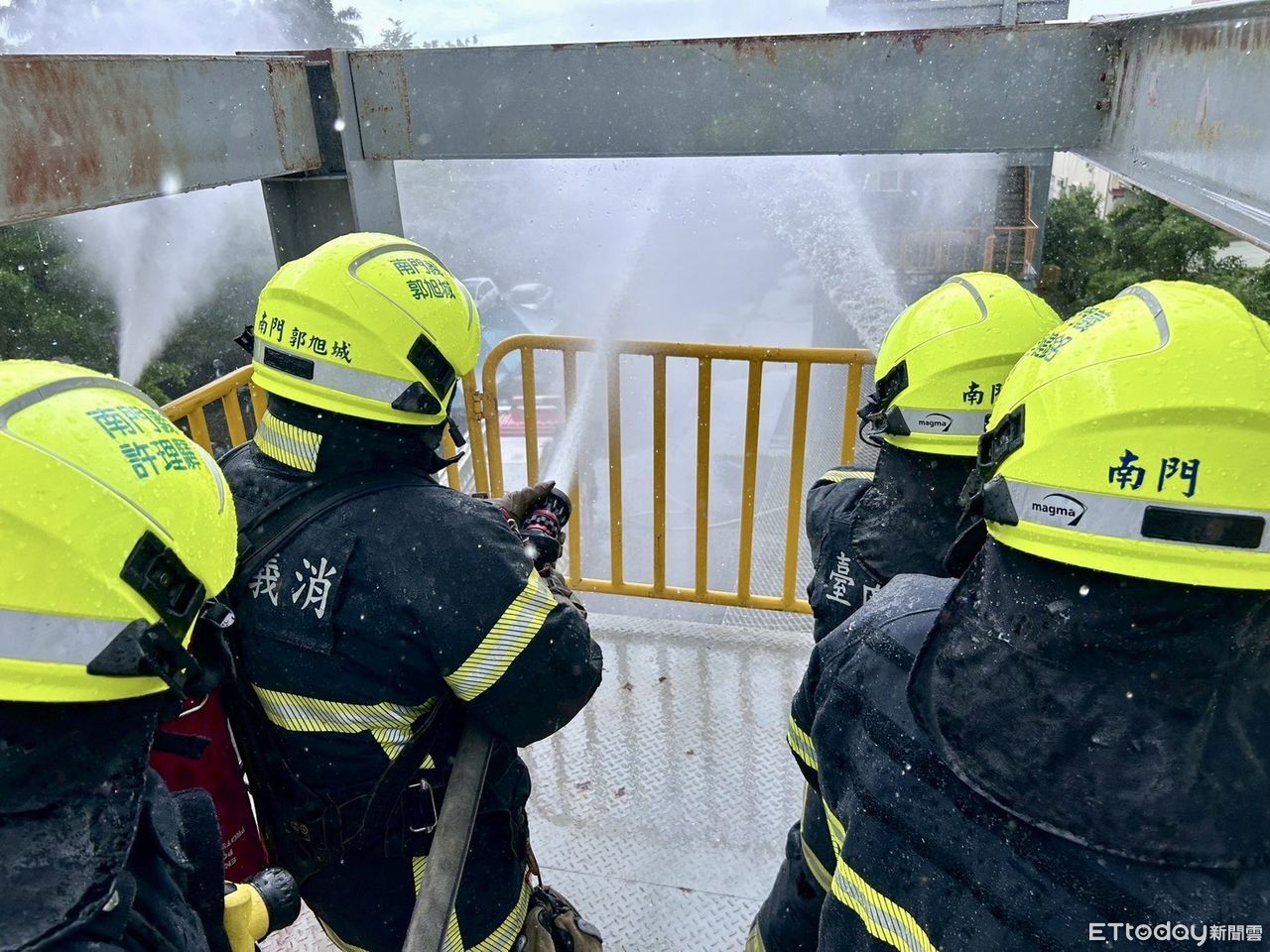 ▲南門義消進行火場攻堅訓練,演練高樓梯間佈線與空間穿越應變操作。(記者林東良翻攝,下同)