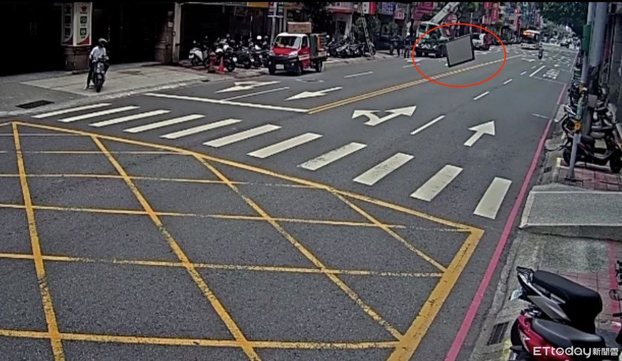 ▼監視器拍下玻璃窗從9樓墜落到1樓馬路上 。(圖/記者陳以昇翻攝)