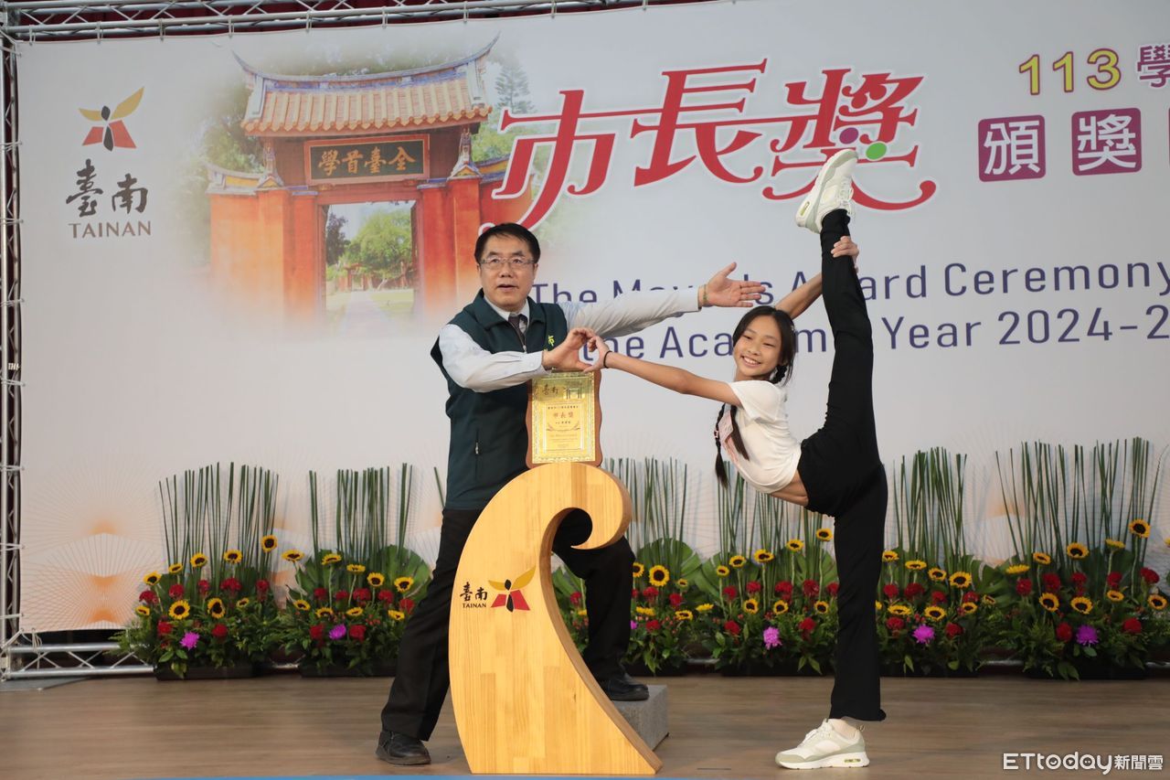 ▲台南市長黃偉哲親自頒獎並與學生創意合影,有人表演一字馬、後空翻,現場氣氛熱絡又感人。(記者林東良翻攝,下同)