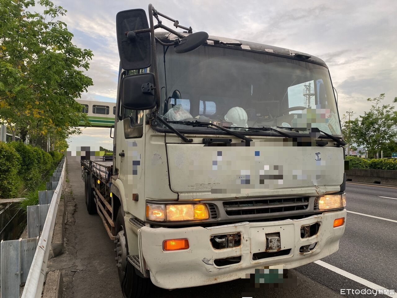 ▲國道1號仁德段18日發生大貨車擦撞自小客車事故,王姓駕駛輕傷送醫,警方初判為變換車道不當所致。(記者林東良翻攝)
