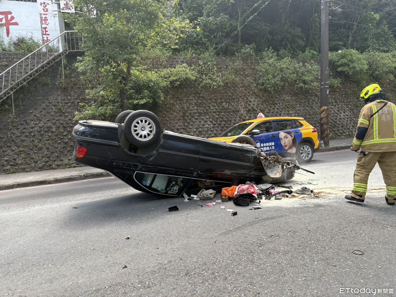 基隆市安樂區基金二路今(28日)上午9時27分許傳出一起車禍事故,一輛自小客車行經該路段時,突因不明原因失控、自撞分隔島後180度底朝天翻覆,警消獲報到場後,立即將受困車內的駕駛鄭男(69歲)救出,幸其意識清楚,後續送往長庚醫院治療。