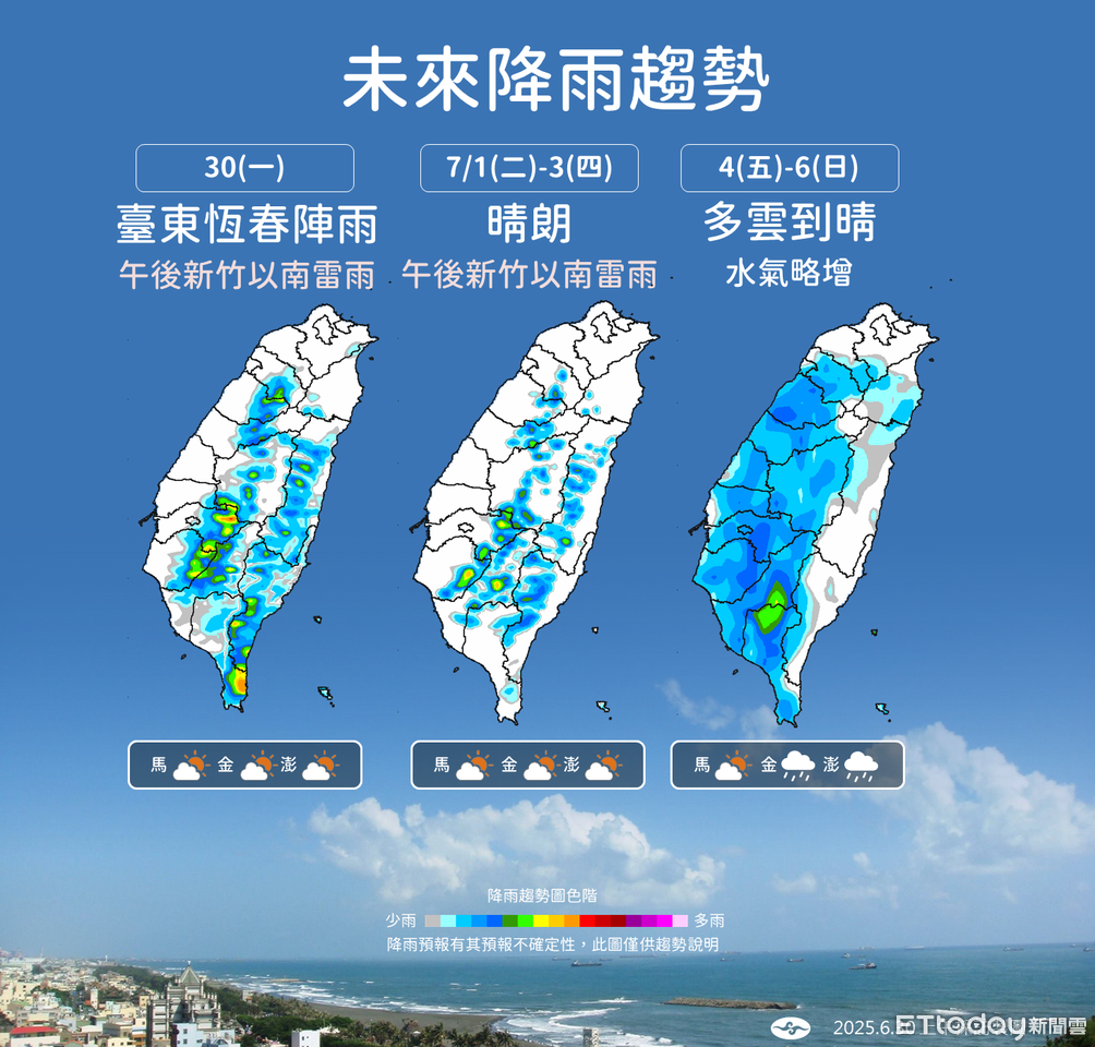 他表示,下周日至周一轉為西南風,各地多雲到晴,午後大台北、宜花地區及各地山區有短暫雷陣雨,清晨至上午中南部地區海陸風可能造成短暫陣雨。