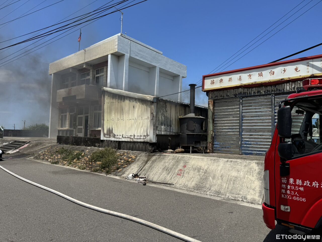 消防局指出,今天上午10時35分許接獲海巡署白沙安檢所報案,指隔壁的鐵皮倉庫竄出濃煙,立即出動通霄、後龍和西湖等3個分隊,總計9車15人前往救災,火勢約在11時05分撲滅,燃燒1層樓鐵皮庫房面積約5坪,出2水線撲滅,無人員受困。