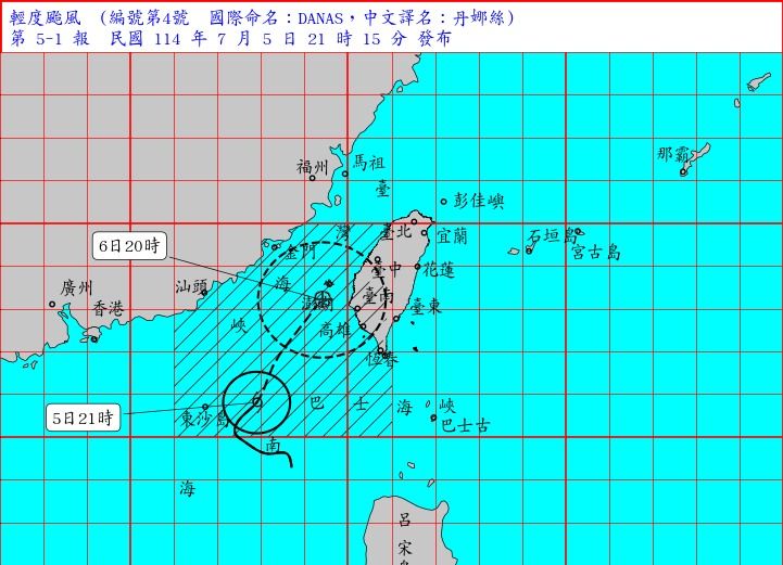 ▲丹娜絲颱風7月5日21時15分警報單。(圖/中央氣象署)