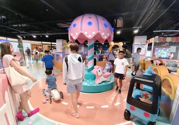 5樓的「朵朵花園」為知名親子品牌「追風奇幻島」打造的主題樂園,設置五大主題區,包括繩網迷宮、滑梯、VR挑戰的【泡泡花園城堡】、擁有34面蹦床的【VR彈跳花園】、充滿農村風格的【童趣稻穀場】、結合職業扮演與積木遊戲的【家家酒積木區】,以及設有旋轉木馬與拍照場景的【油桐花坊】,提供小朋友豐富的感官探索與創意學習空間,成為親子家庭夏日出遊的熱門選擇。