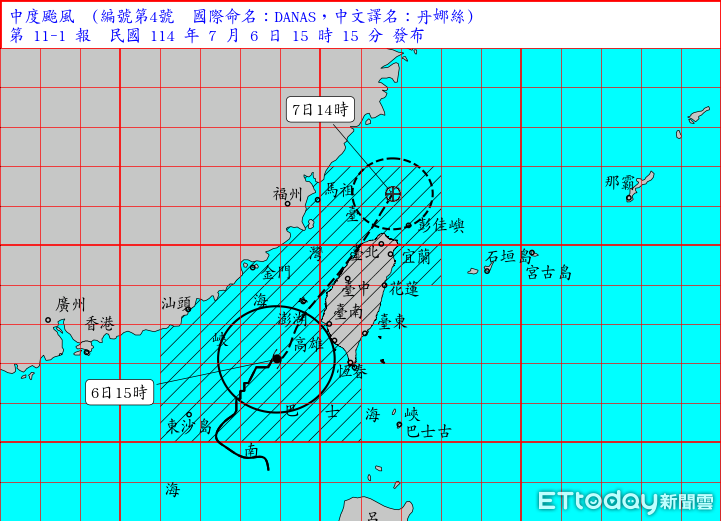 ▲丹娜絲暴風圈今天下午已接觸澎湖南邊。(圖/氣象署)