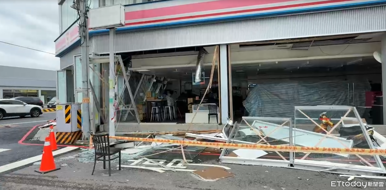 現場影片中可以看見,超商在玻璃上都用膠帶貼成X,仍防不了強風直接吹掀整面玻璃窗,壓垮路旁機車,超商直接被迫對外開放,店員們目前也忙於清潔髒亂的店面。