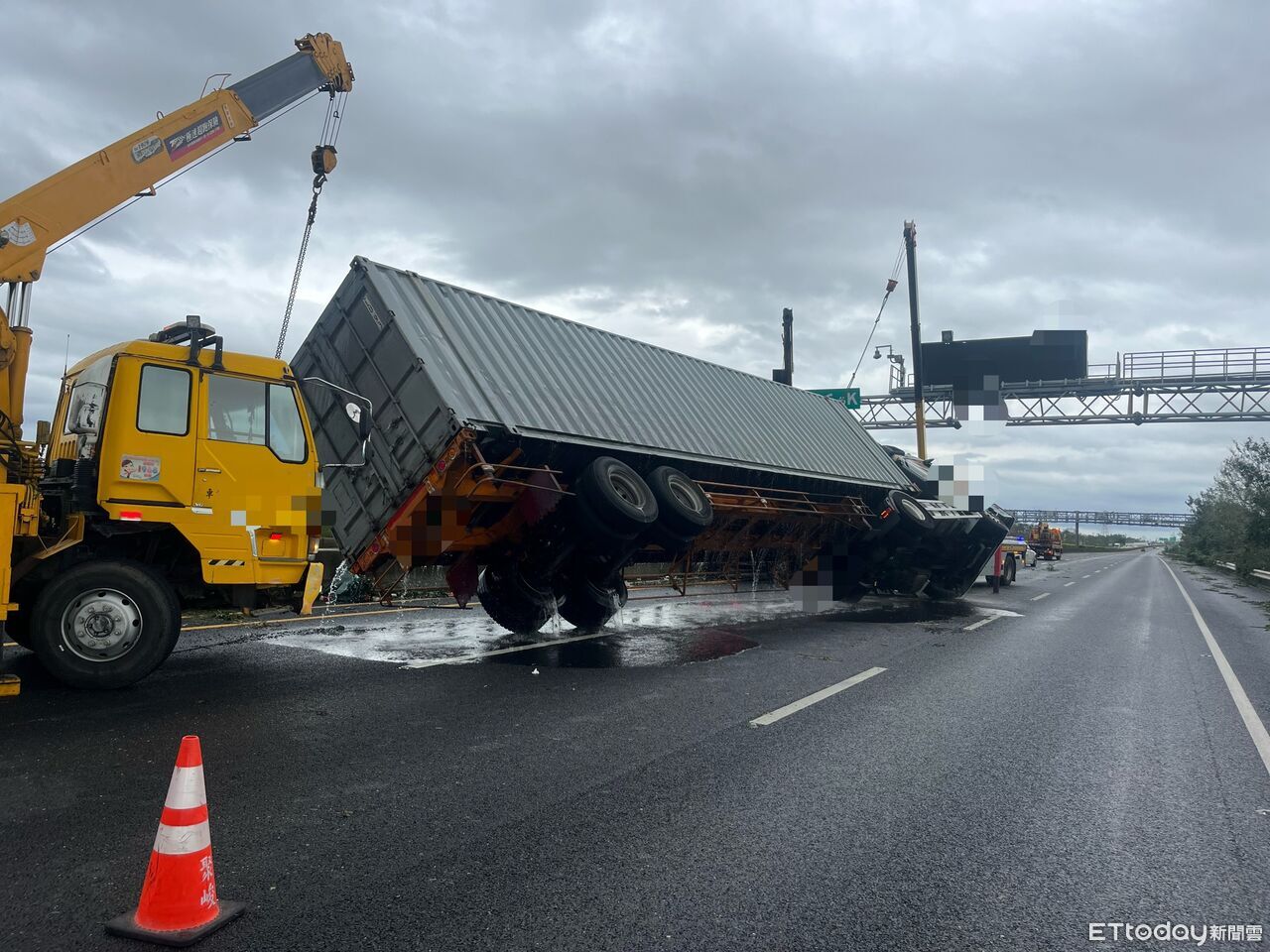 ▲國道1號台南段7日凌晨發生大貨車翻覆事故,所幸無人傷亡,警方迅速處理現場。(記者林東良翻攝,下同)