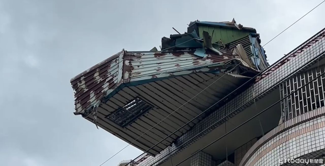 ▲台南市將軍區將軍里有1棟透天民宅頂樓的廢棄鴿舍被強風吹塌,約二分之一懸露在頂樓,搖搖欲墜十分驚險。(圖/記者林東良翻攝,下同)