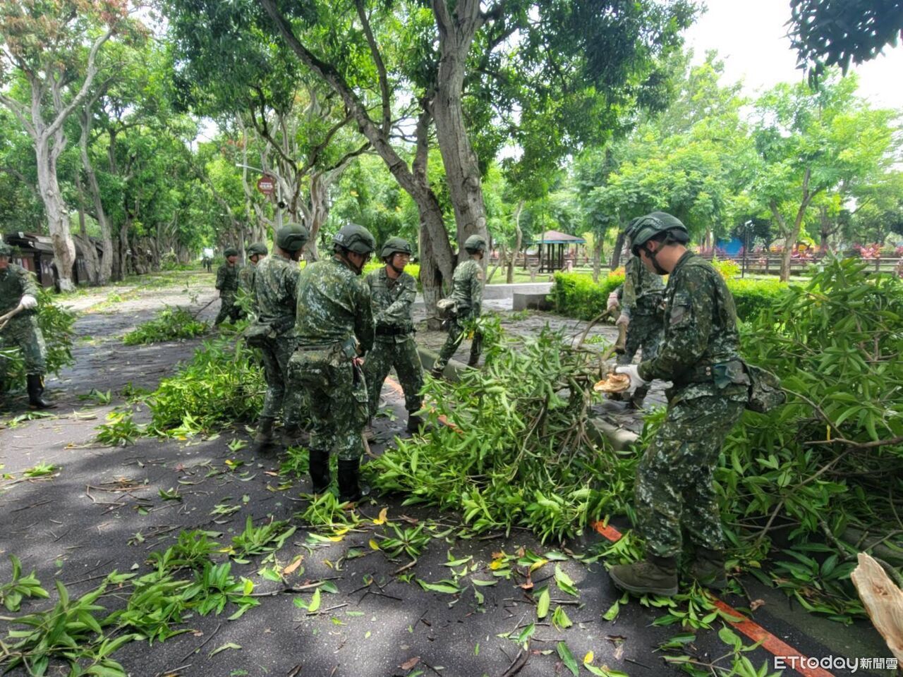 清晨風雨稍歇,綠色隧道現場可見滿地殘枝與倒塌樹木,路面景象宛如災後戰場,除影響觀光通行,也恐危及民眾行車安全。為加速搶通作業,雲林縣政府緊急向國軍申請支援兵力,獲迅速回應,陸軍砲兵部隊測考中心政戰主任顧哲豪上校率20名士兵們扛鋸具、搬巨幹、徒手揮汗作業,不到半天就排除大半路障,為交通盡速恢復鋪路。