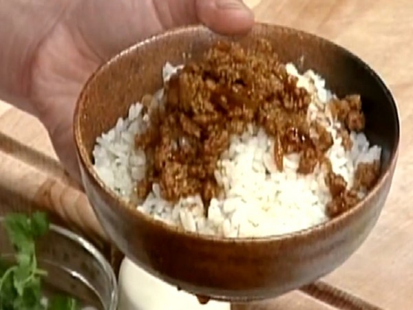 4.食用時,於飯上灑上少許白胡椒粉,淋上肉燥,灑上少許香菜末即完成