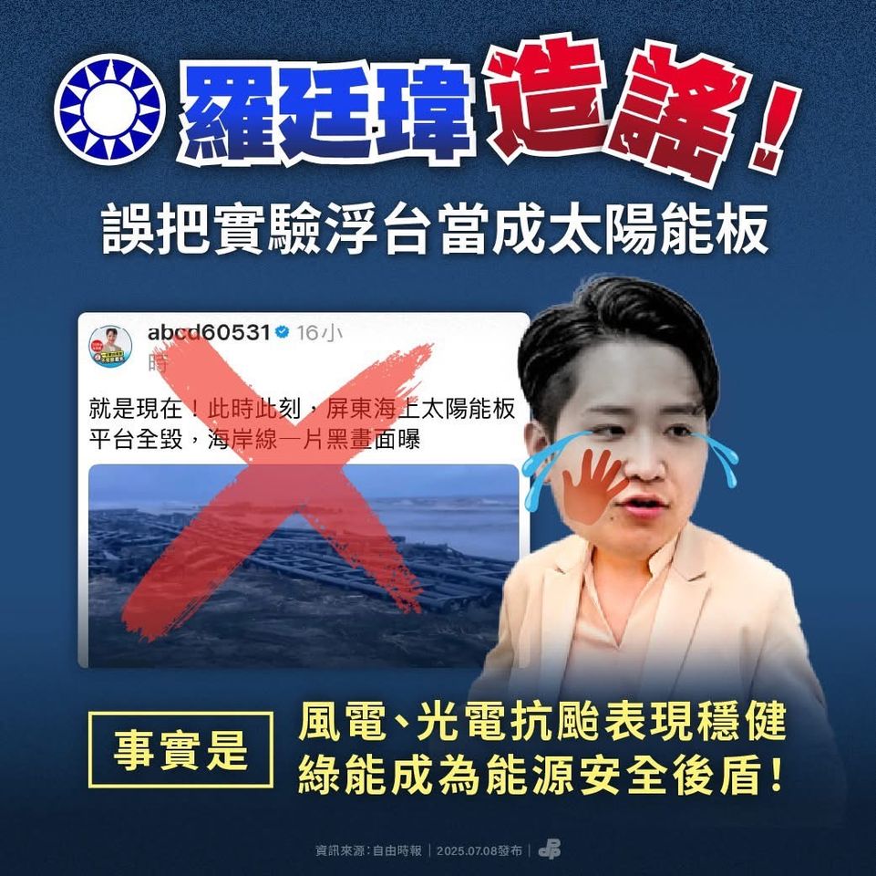 颱風丹娜絲橫掃後,台中立委羅廷瑋發文表示,就是現在!此時此刻,屏東海上太陽能板平台全毀,海岸線一片黑畫面曝。而羅廷瑋曝光的畫面中,僅有「實驗浮台」,並無太陽能板。對此,民進黨今(8日)表示,羅廷瑋無知又造謠,誤把「實驗浮台」當成太陽能板,颱風剛過,救災與復原的工作還在進行中,羅廷瑋不努力協助選區民眾、不仔細檢討台中市離奇淹水的原因,卻忙著在社群平台發文、對發生在屏東的事情指指點點,不查證就造謠,只不過是凸顯出自己的無知。