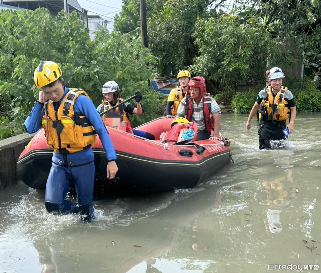 ▲永靖淹水1米深,消防緊急用救生船將災民撤離。(圖/記者唐詠絮翻攝)