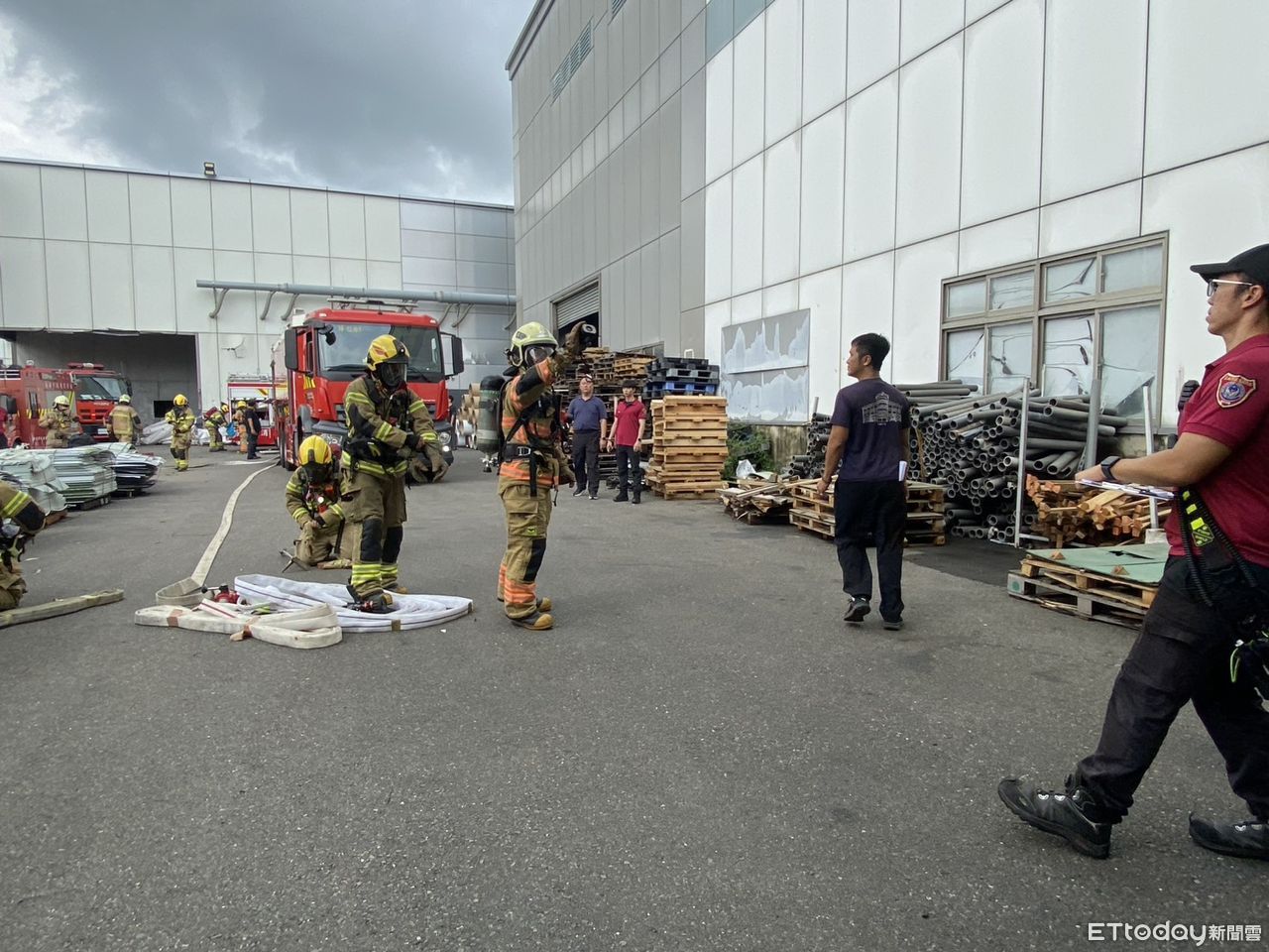▲消防人員於森鉅科技廠區模擬化學品洩漏事故,依H.A.Z.M.A.T.程式進行應變處置。(記者林東良翻攝,下同)