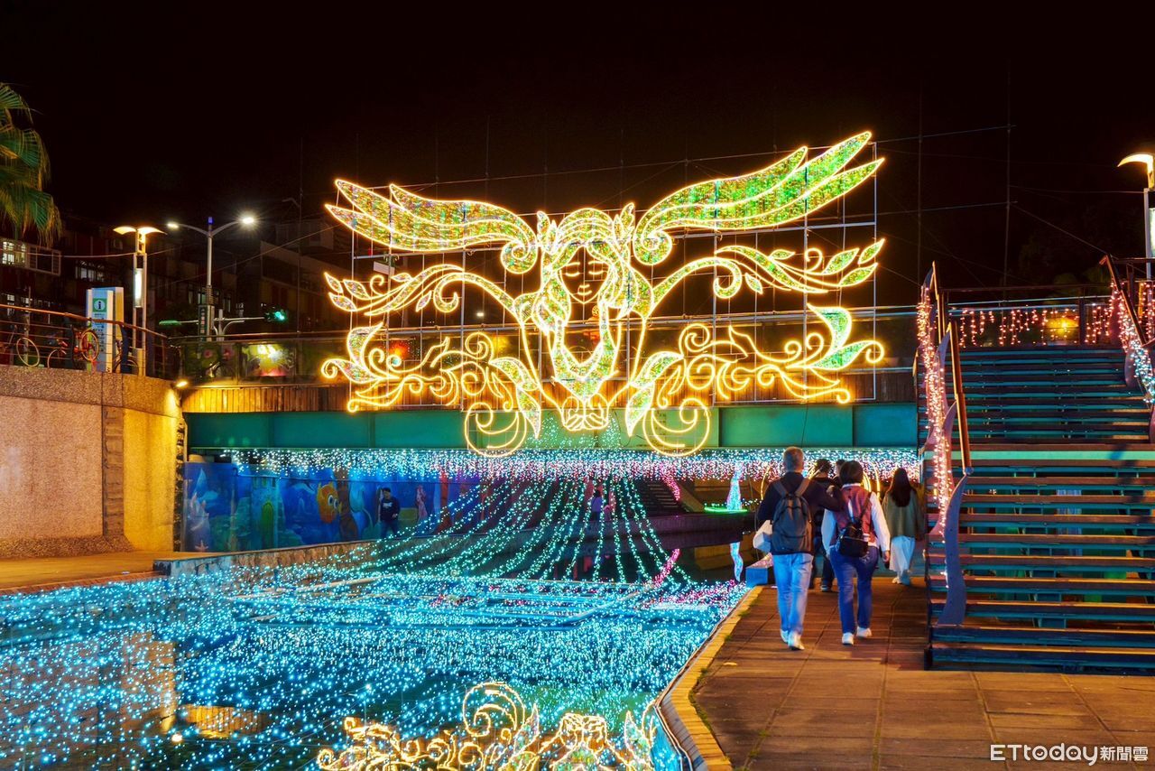▲新北市水利局巧妙運用水面倒影,成功打造令人驚豔光雕展演。(圖/新北市水利局提供,下同)