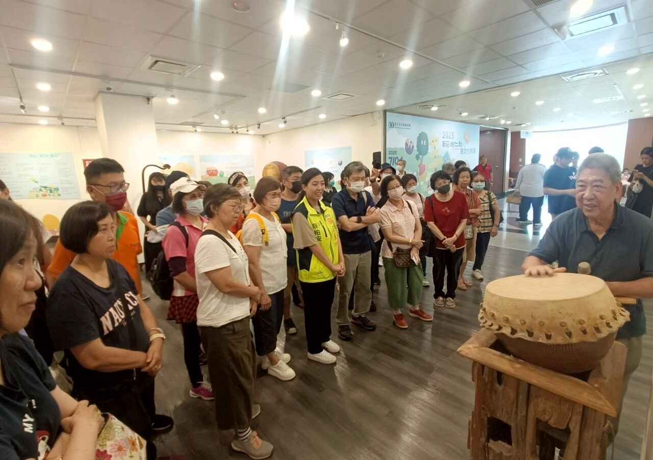 ▲响仁和第三代王藤導覽「2025新莊响仁和鼓文化特展」展場。