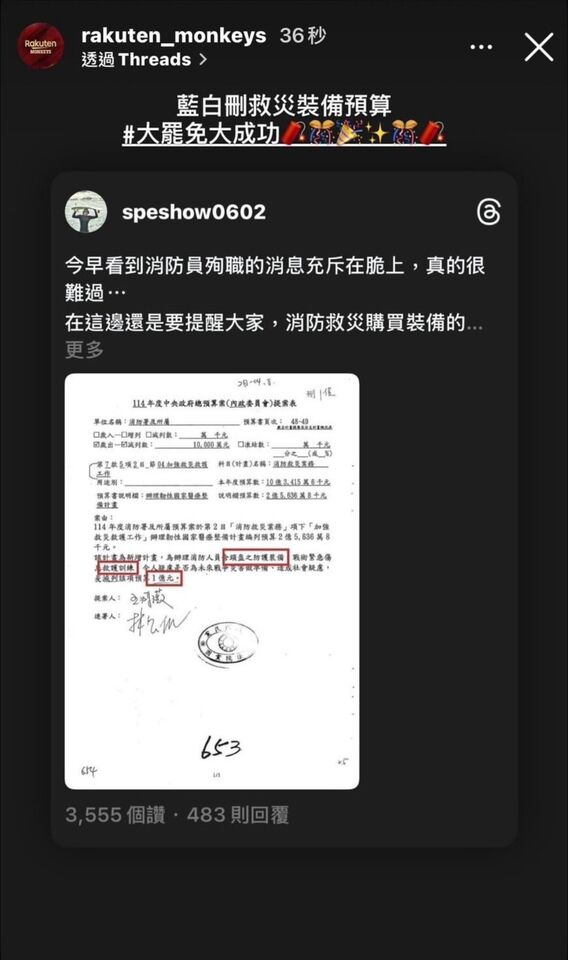 中華職棒球隊樂天桃猿今天在社群平台instagram限動轉發一篇網友指控「消防救災購買裝備遭藍白刪除」的貼文,並且還打上藍白刪救災裝備預算,大罷免大成功,雖然隨即刪除,但依舊遭到網友截圖廣傳,引起各界議論。