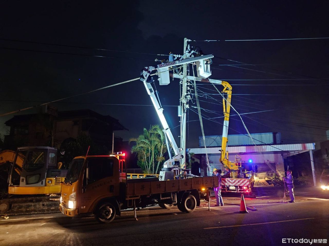 目前初估本次颱風造成五、六百根電桿損壞,單一根電桿的設立與接電平均需耗時逾兩小時,台電人員在風雨中日以繼夜搶修,只為盡早讓家戶恢復供電。