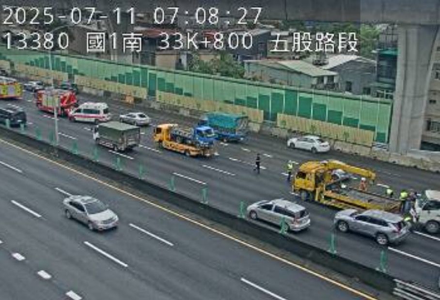 ▲國一北上33.8公里處小貨車追撞。(圖/翻攝1968網站,下同)記者葉國吏/綜合報導 國道1號北上泰山-五股段、33.8公里處,有2輛小貨車追撞佔用外線,造成該路段塞車紫爆、時速不到20公里。