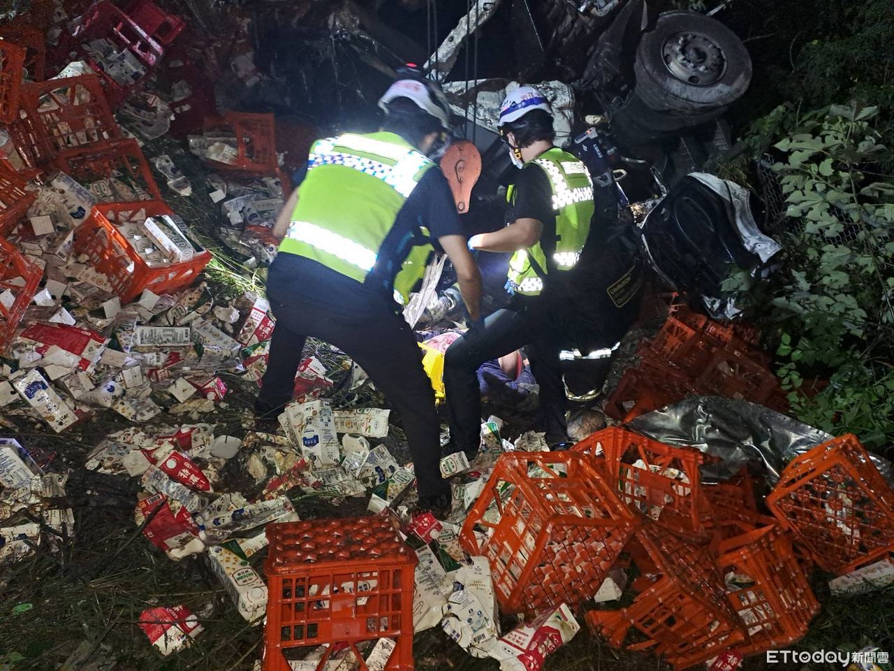 警方初步調查,事故發生前轎車疑似故障拋錨在外側車道,楊姓男子一度下車在車後推車,後來坐回車上休息等待救援,載運乳製品的大貨車,疑似視線不良,看到故障車已煞車不及,擦撞轎車後大貨車往外側邊坡衝撞,結果大貨車翻滾造成林男重傷、車體嚴重毀損,轎車駕駛也一度困車內,後來自行脫困送醫。至於雙方是否有酒駕、肇事真正原因,正由警方調查中。