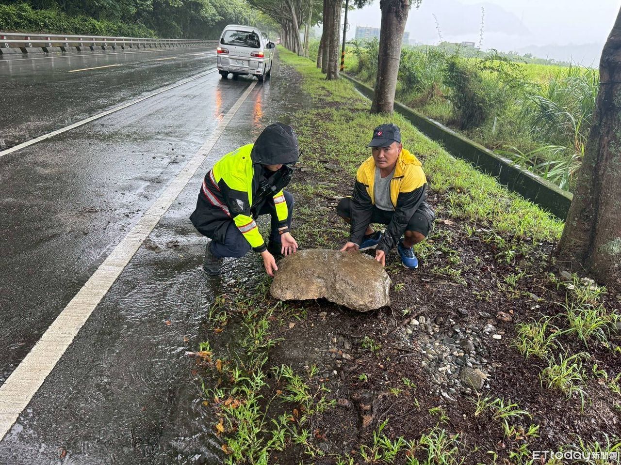 據了解,現場出現三塊落石,體積不一,其中兩顆為較大型岩塊,橫躺車道中間,嚴重影響車輛通行,潛藏交通風險。鹿野分駐所獲報後,立即派出巡邏警員簡士瑋與馮文威火速趕抵現場,並與民眾合力將落石移置至安全處,同時設置交通錐警示來車,防範二次事故。