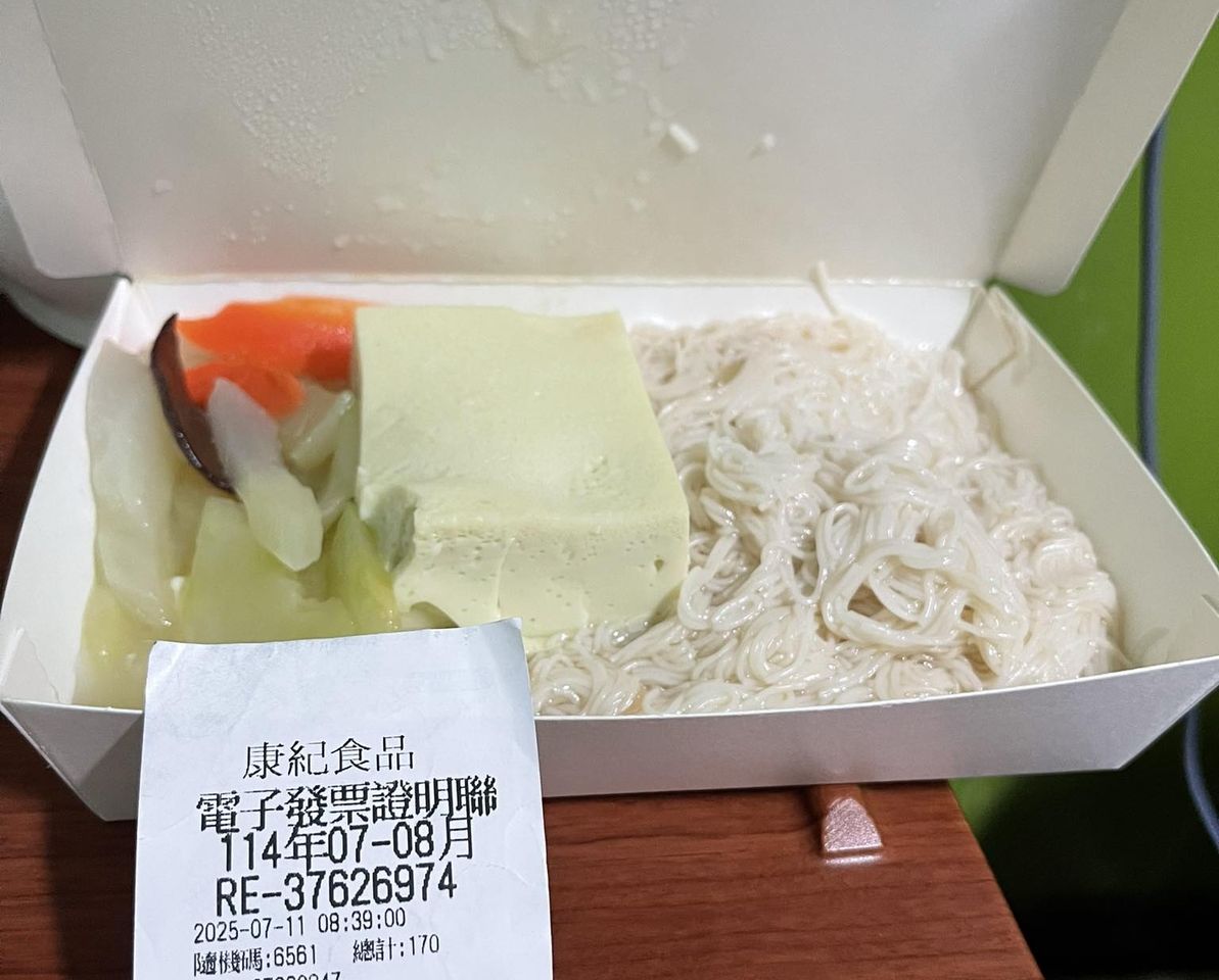 原PO在「爆料公社」貼出照片,從中可見,他夾了一份蒸蛋、一份瓠瓜和半盒麵線,沒想到發票上顯示這頓要價170元,讓他難以置信。