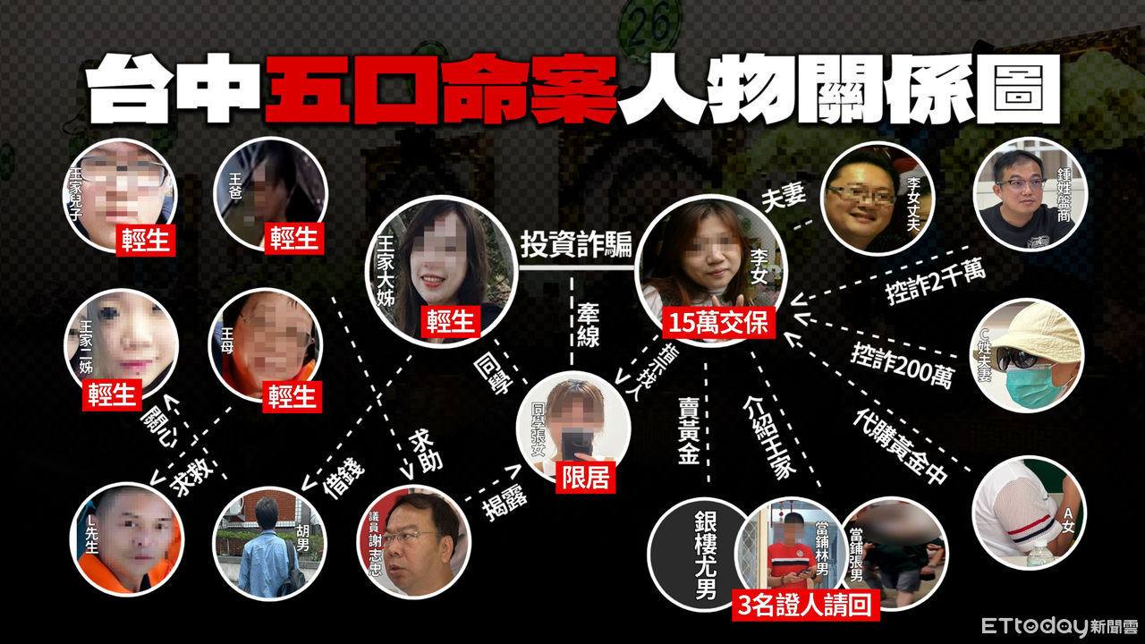 台中市豐原區五口命案震驚社會,檢警持續向上追查,要釐清逼死王家五口的主因,是否有詐騙集團介入主導,李女幕後是否有藏鏡人?李女還遭多名證人起底,證明2019年間就有多次詐欺行為,從原先的幼稚園、安親班老師(負責人),變成遊走玩弄法律的詐欺慣犯,猶如小魔變成大魔。《ETtoday新聞雲》以圖表方式整理案件目前進度,以及案情中各關係人、犯嫌彼此聯絡情況。