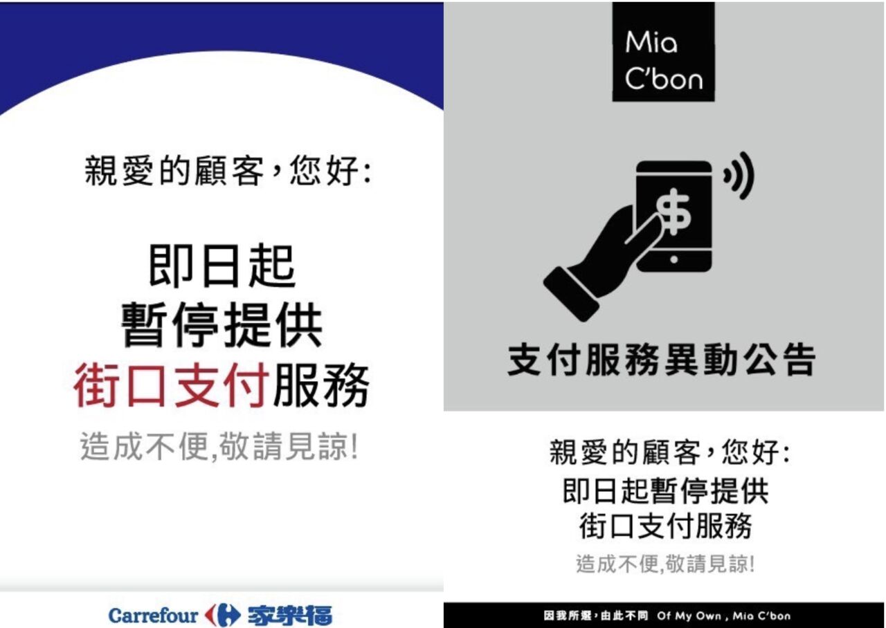 但量販店家樂福、家樂福超市與超市Mia C’bon則發布公告表示,即日起暫停提供街口支付服務,並表示若有恢復,會盡快另外公告。