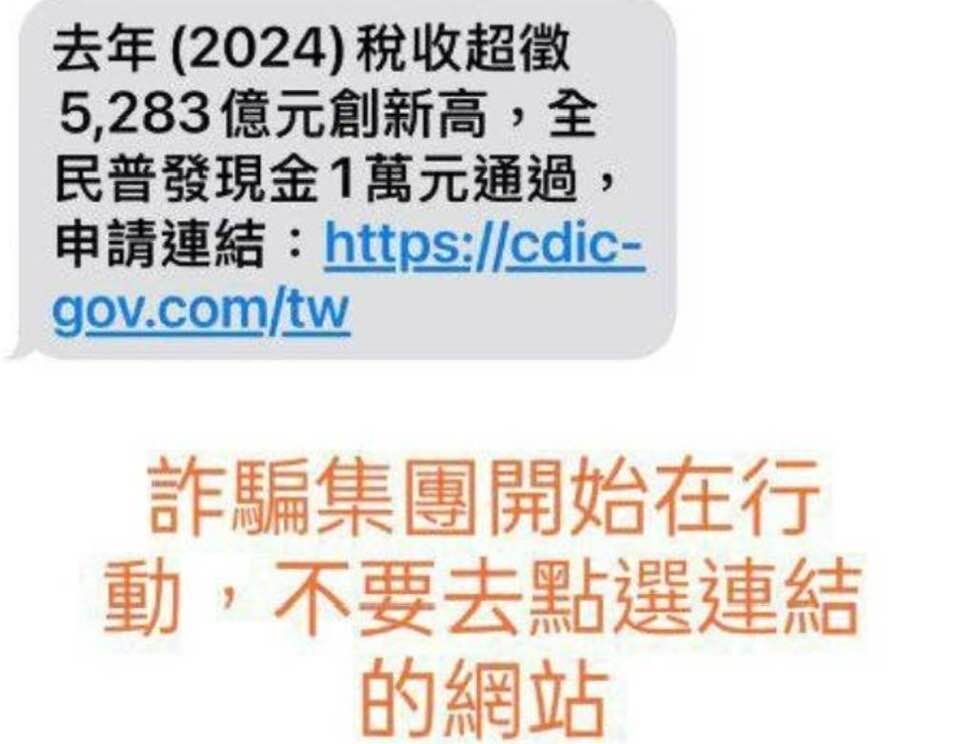 刑事局12日緊急發布公告,指稱詐團已盯上普發1萬元的消息,開始發送詐騙簡訊,誘導民眾點進連結、填寫個人資料。