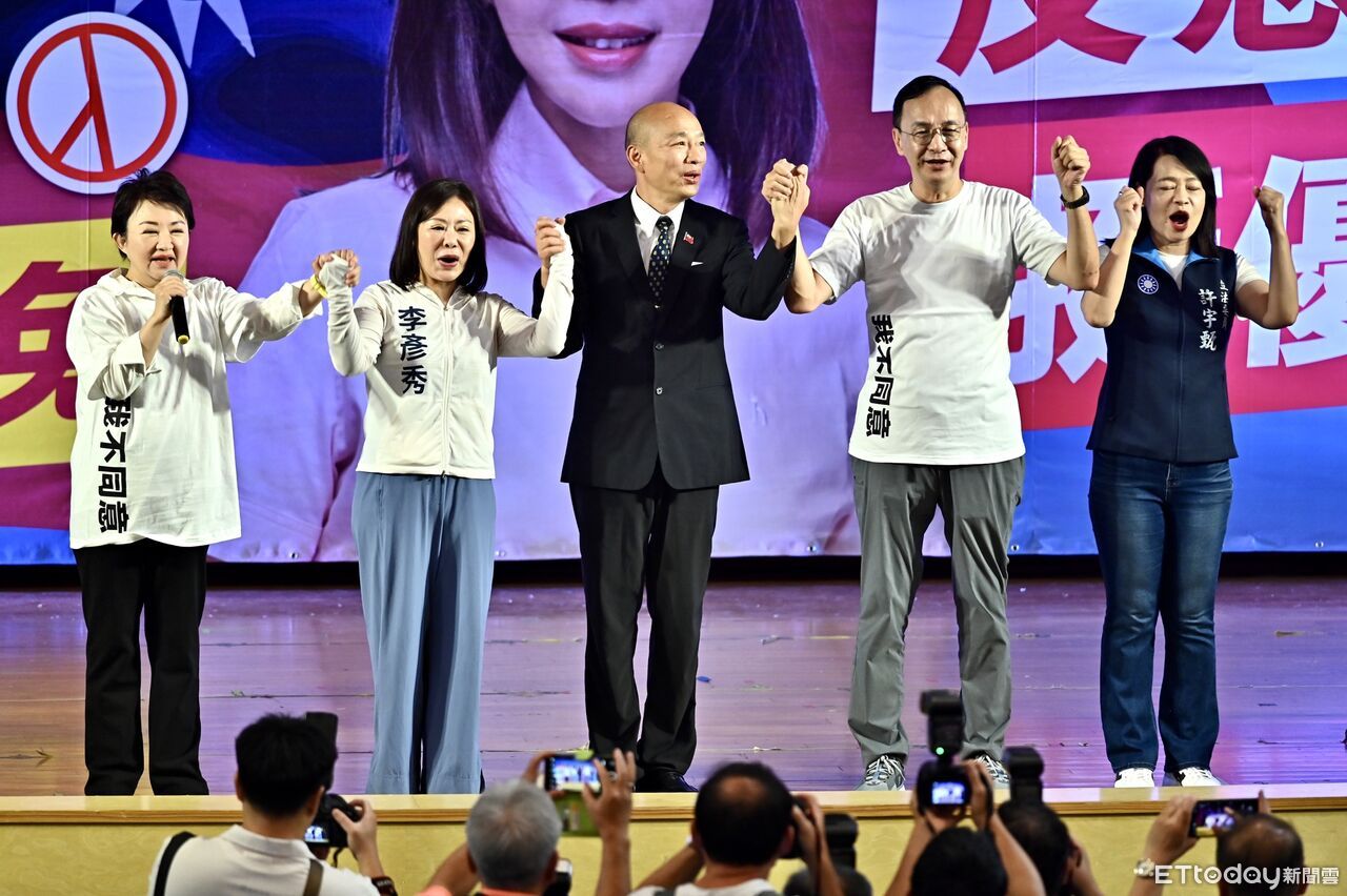 ▲盧秀燕、朱立倫、韓國瑜13日同台「三星拱月」聲援李彥秀 。(圖/記者李毓康攝)