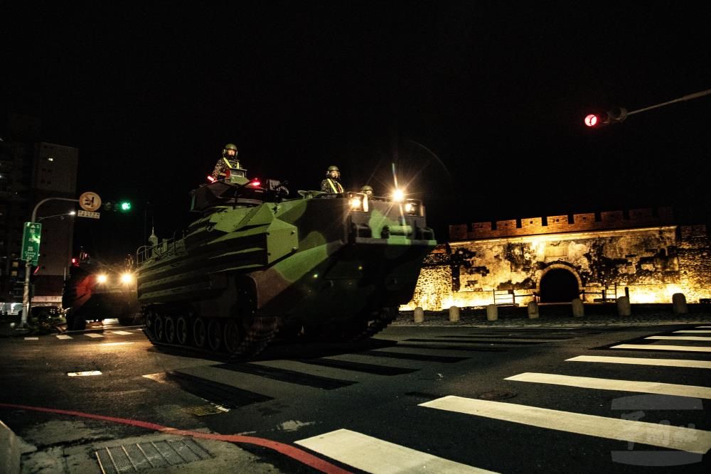 部隊接獲狀況後,官兵立即投入指揮所轉移整備及通信構聯等工作;過程中,AAV7兩棲突擊車在夜晚的街道中穿梭,官兵在昏暗的環境下時刻保持警戒,車長、駕駛全神貫注,透過模擬實際戰場景況進行操演,使官兵熟稔戰場環境,並藉由指揮所轉移流程,強化「指揮、管理、通信、情報」整合運用,確保各部隊遂行作戰任務及指參作業,以利達成任務。