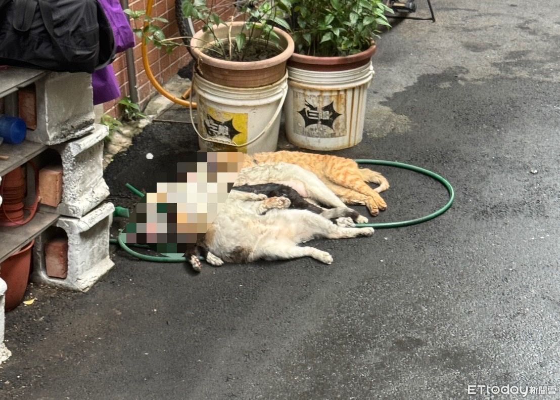 ▼鄰居照顧倖存的橘貓,旁邊黑狗已經死亡 。(圖/記者陳以昇翻攝)