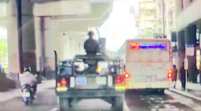 影片顯示,該輛軍用悍馬行經康寧路三段、捷運葫洲站前時,擦撞停靠一旁的公車,將公車的照地鏡直接撞飛,車上的軍人也回頭看了一下。