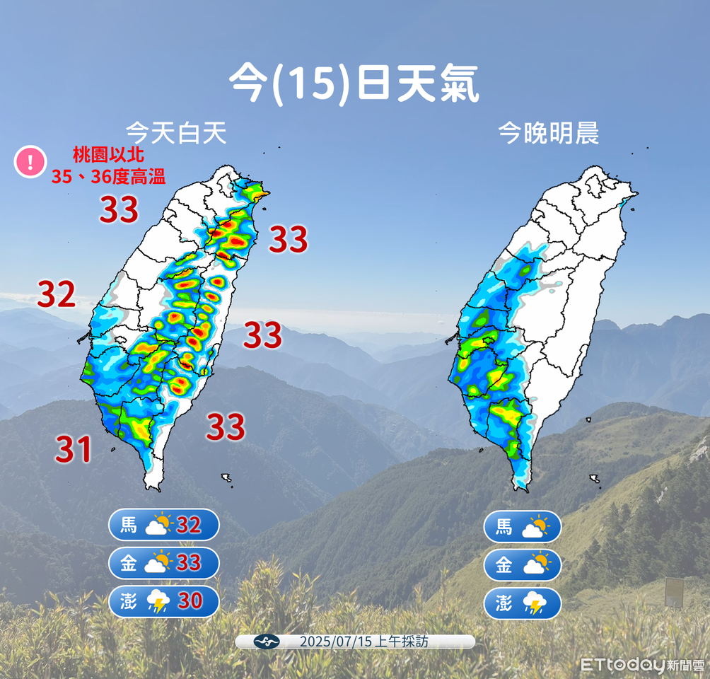 今、明天西南風影響,苗栗以南及新竹整天不定時有短暫陣雨或雷雨,其他地區為午後雷陣雨,菲律賓東方海面熱帶系統最快周四發展為熱帶性低氣壓或颱風,周五至周六最接近台灣,天氣轉為不穩定,路徑以通過巴士海峽機會最高,屆時東半部要留意較大雨勢。