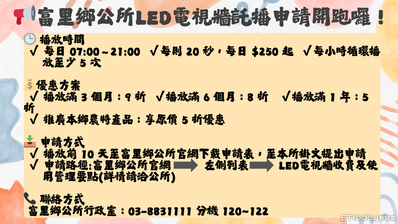 ▲鄉公所電視牆播放時間及優惠方式。(圖/富里鄉公所提供)