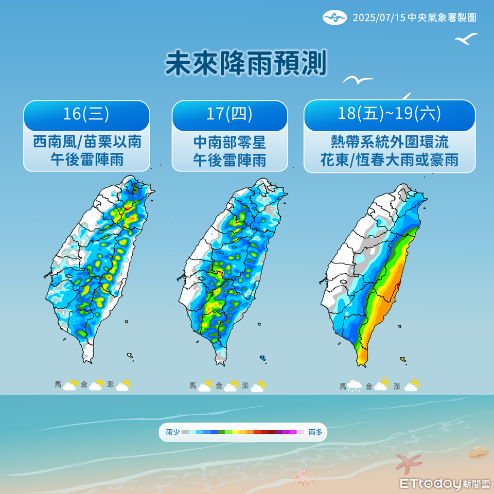 溫度方面,他指出,明天高溫炎熱,北部有35至36度,各地也都有32至34度,周五東半部降雨影響,高溫略降為28至30度。另外,他表示,周五晚間起北海岸、東半部及恆春半島沿海有長浪,周六至下周一南部沿海也有長浪。