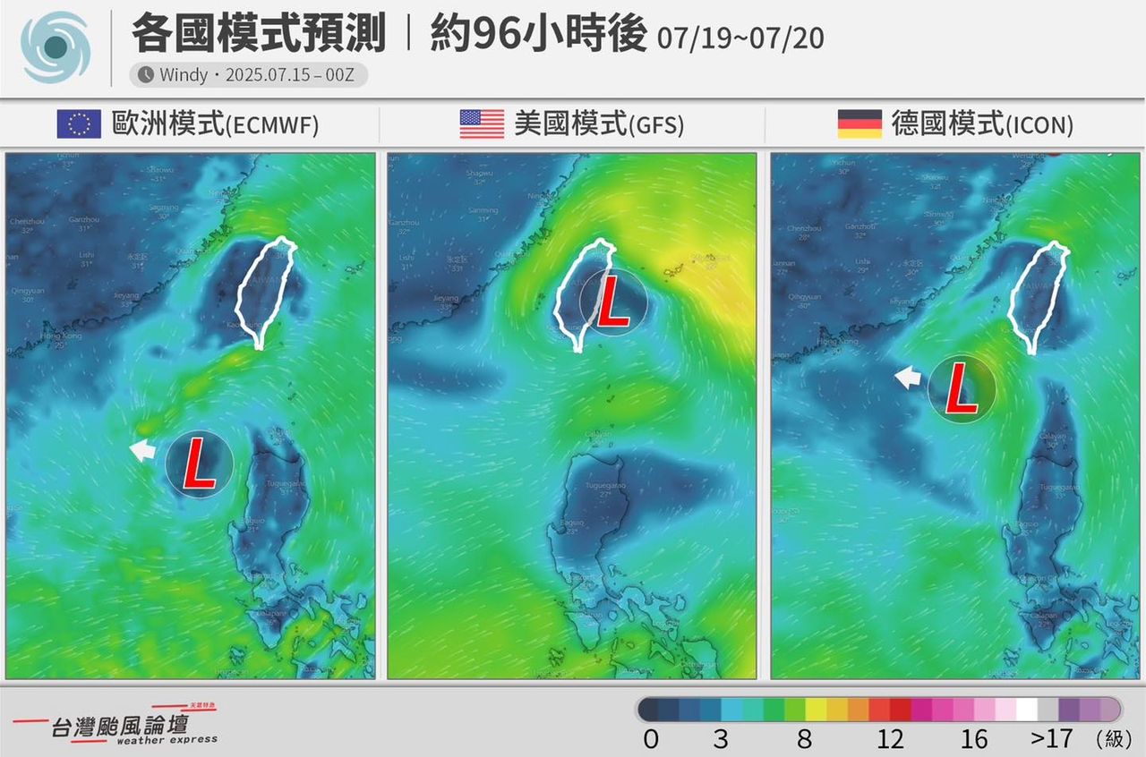 「台灣颱風論壇|天氣特急」臉書提到,受太平洋高壓導引,低壓96W的大方向會往「台灣~菲律賓」這個大方向前進,周末附近是它最接近台灣的時刻,到這裡各國模式算是有共識,但具體走西北的角度就有落差了。