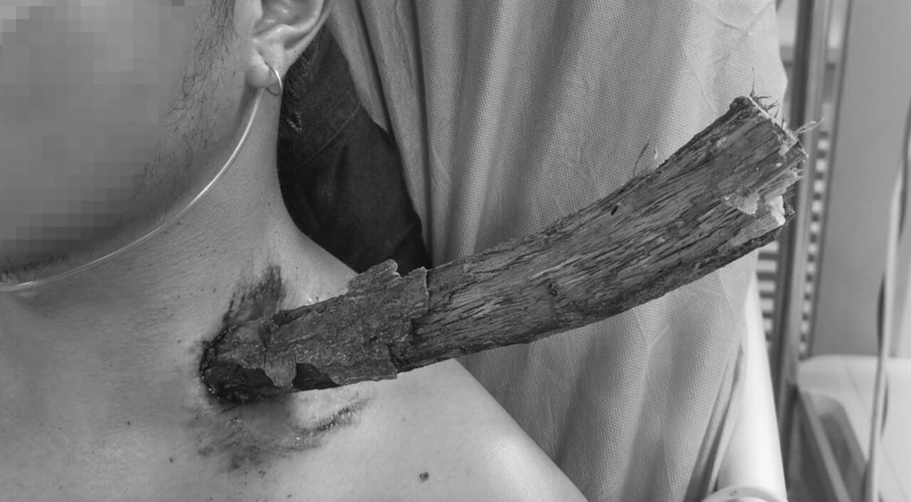 隨後,醫護團隊成功取出異物,並清理創口表面殘留的樹皮木屑,「樹枝兇猛,竟又萬幸避開了所有的大血管,讓患者與『死神』擦肩而過,他簡直太『幸運』了」。