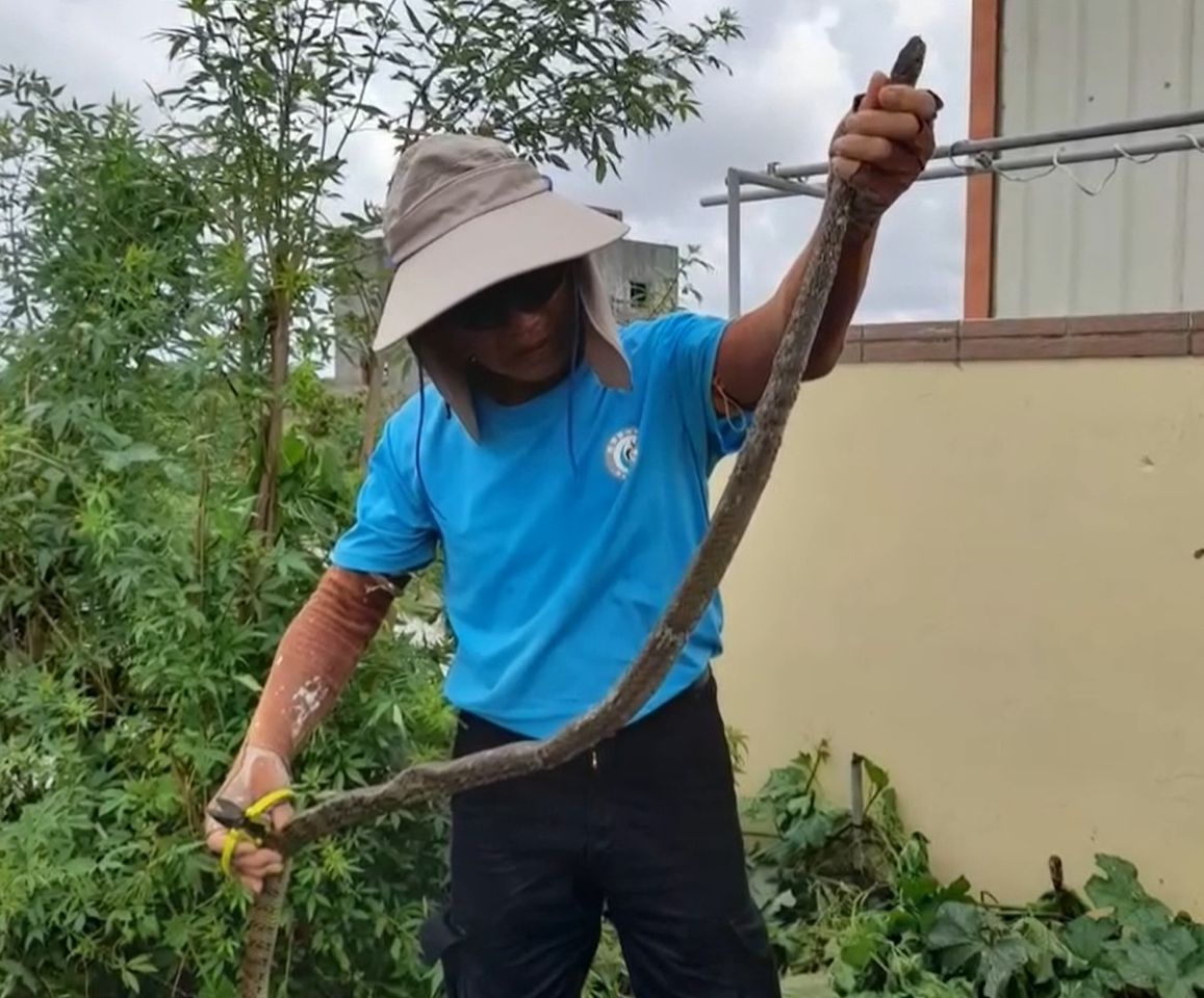 王金樹里長說,14日中午11時左右他接獲通報,有住戶家門外驚見一條大蛇在掛網中掙扎,他趕到現場發現是一隻無毒臭青母,長約2米、但蛇體狀況虛弱,立刻徒手將牠解救後野放。