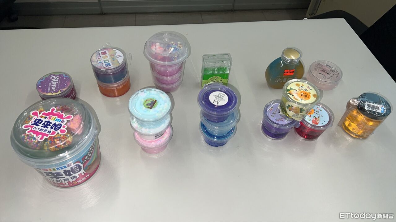 ▲台中市法制局送驗9款市售史萊姆黏土,當中有5款(前排),被驗出硼元素超標。(圖/台中市法制局提供)