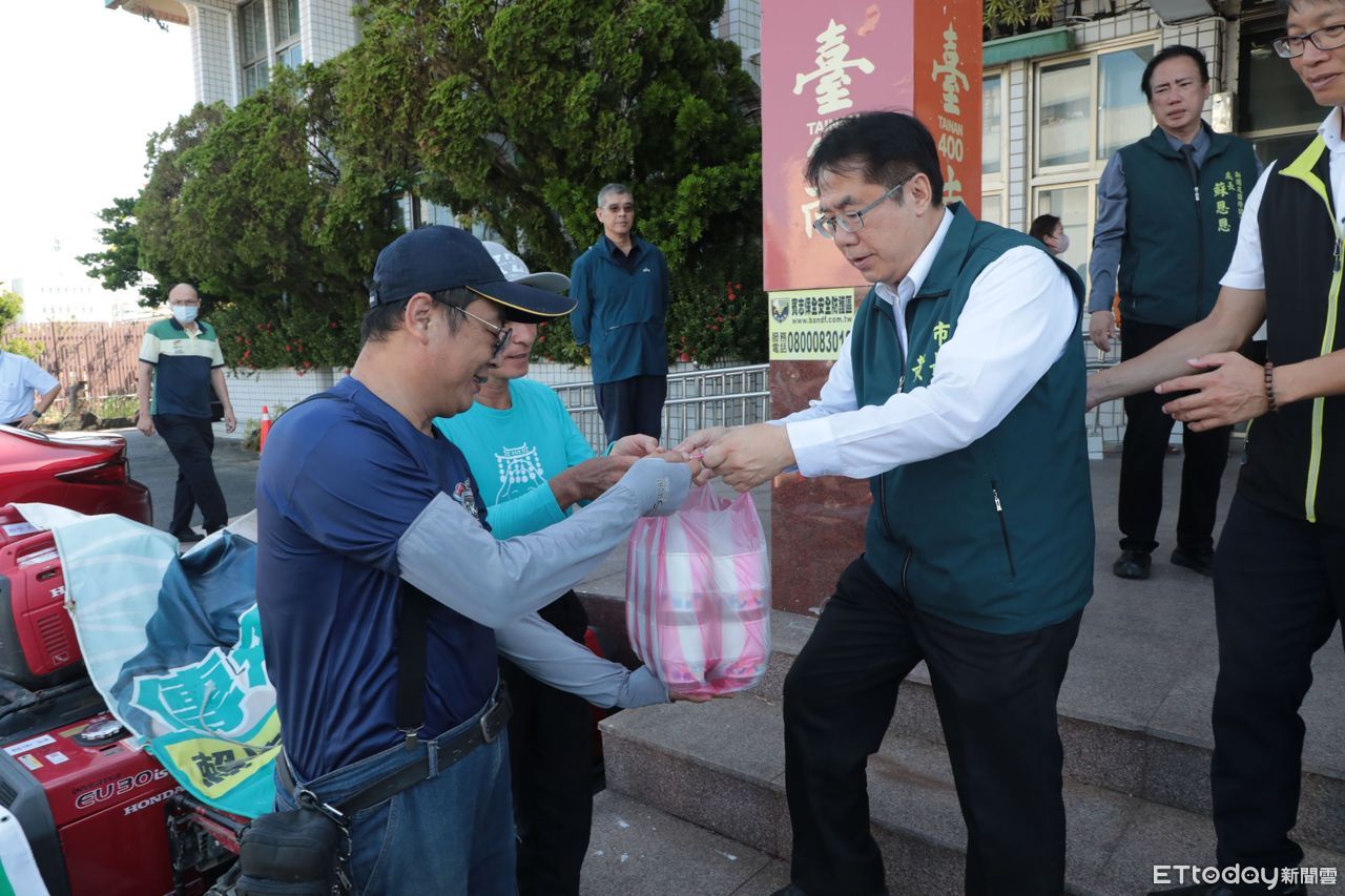 ▲黃偉哲17日前往北門災區視察,向參與重建工作的義消與替代役致意,並親送豆花慰勞人員。(記者林東良翻攝,下同)