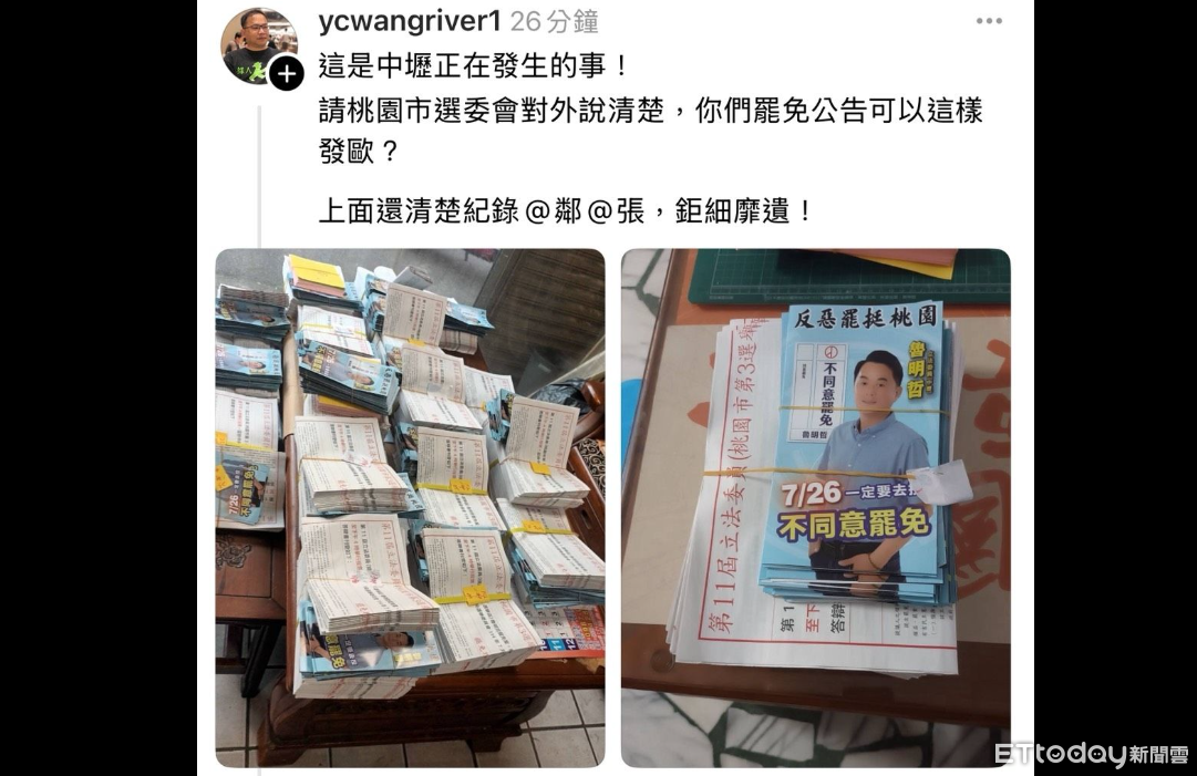 ▲王義川在threads上PO文,爆料桃園有里長將反罷免文宣夾入選舉公報中。(圖/翻攝王義川threads)